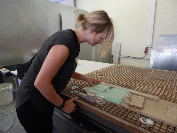 For the prototype acrylic glass was milled by a CNC mill. For industrial mass production the design is producible by the so called ”Blow-Blow-/ and Press-Blow Process”.